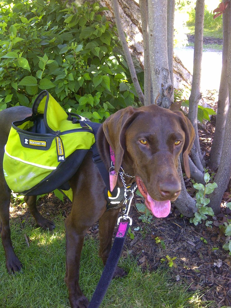 Julie takes forever to get herself ready for a hike. Really, how long does it take to put a bag of my treats, my water bucket, and her wallet into my backpack. Come on. The trails at Fish Creek Provincial Park are ready for me.