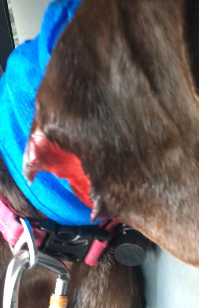 I am thankful Julie had taken some dog first aid courses. She went to a pharmacy buying bags of white things. Long strips and square shiny pads. See in one picture what she did to my head! I look as though she was dressing me as a mummy from a horror show for Halloween. Only it is not Halloween.
