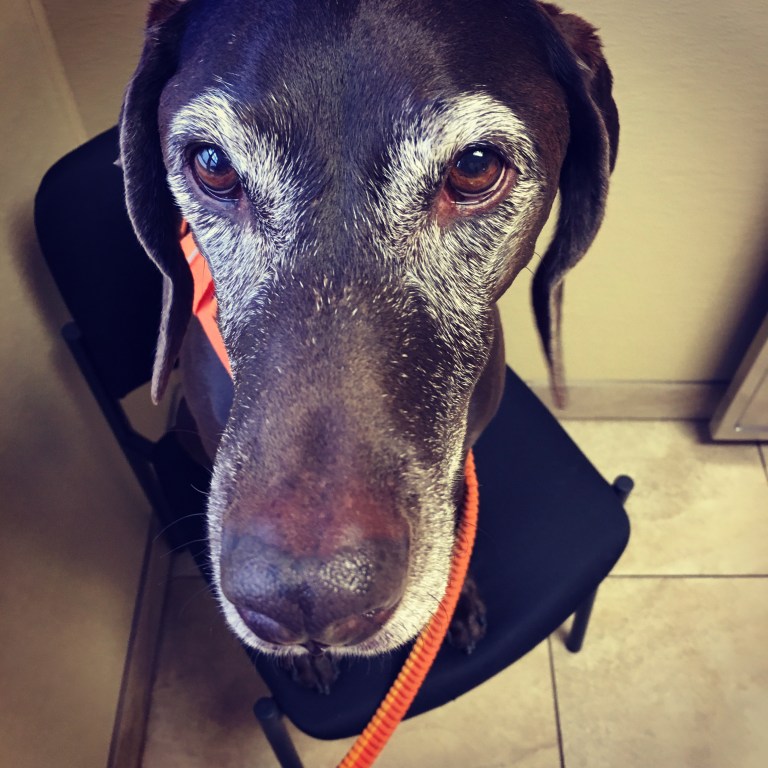 I’m at the vet’s again. The best place when here is the chair in the corner of the room because I can see outside AND I can see and SMELL the container of dried liver squares on the counter.