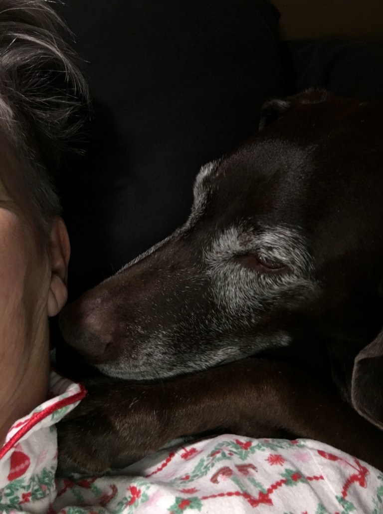 Tonight, I want to be close to her so I put a paw on her shoulder and my nose to her ear.