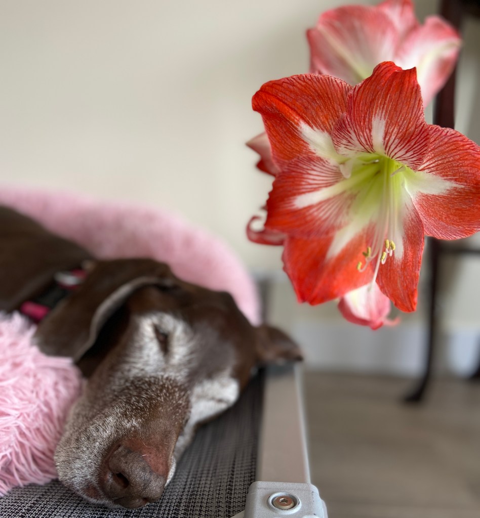 Last year, sometime in December 2021, Julie brought home some weird bluby things in pots. Oh, they were prettily dressed up with shiny wrapping and bows, but still, tiny green pointy bits poking up from the pots looked like she was growing tongues.