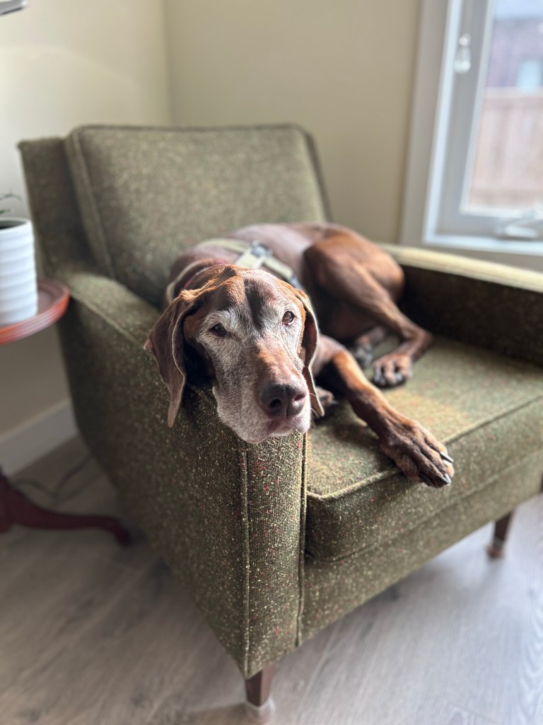 I do have a favourite and this is it right now. On a sunny morning, I settle down with my chin on the chair’s arm which affords me full view of Julie fussing around in the kitchen.
