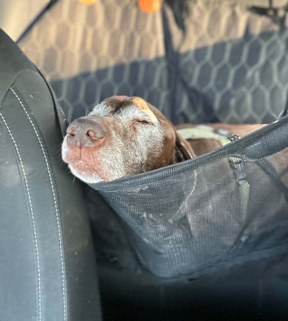 I am not feeling well today and find wonderful comfort in the car hammock as Julie drives me to Paws Only Inn.